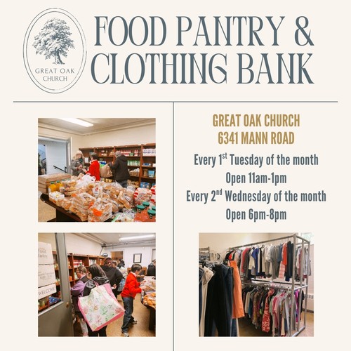 | The Great Oak Food Pantry & Clothing Bank is open every 1st Tuesday of the month from 11am-1:00pm & 2nd Wednesday of the month from 6:00pm-8:00pm at 6341 Mann Road. Our Clothing Bank has gently used clothing for children and adults. You can visit one of our food pantry times once a month. |
